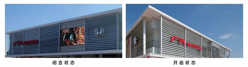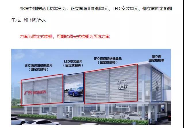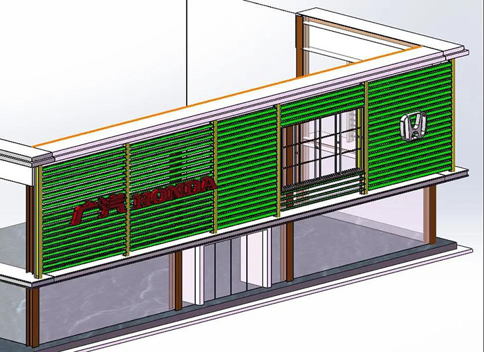 外遮陽(yáng)·格柵采用遮陽(yáng)技術(shù),在其全壽命期內(nèi)可節(jié)約資源、保護(hù)環(huán)境、減少污染,為人們提供綠色健康、適用、高效的使用空間,為低碳生活增添了一絲不一樣的新元素。下面小編推薦這款個(gè)性化廣汽本田4S店的節(jié)能改造產(chǎn)品-外遮陽(yáng)·格柵,充分利用格柵葉片合理控制太陽(yáng)光線進(jìn)入室內(nèi)和調(diào)節(jié)光線方向,有效的起到夏日遮陽(yáng)隔熱、冬日保溫采暖。這種具有“動(dòng)感”的建筑物形象是現(xiàn)代技術(shù)解決人類(lèi)對(duì)建筑節(jié)能和享受自然需求而產(chǎn)生的一種新的現(xiàn)代建筑形態(tài)。