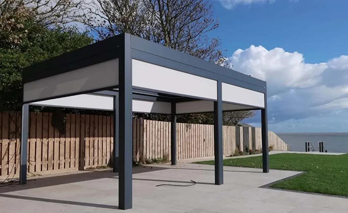 這是國外一家私人別墅的戶外空間設(shè)計(jì),作為高端的戶外遮陽獨(dú)立產(chǎn)品,設(shè)計(jì)師也采用了電動戶外休閑遮陽涼亭方案。