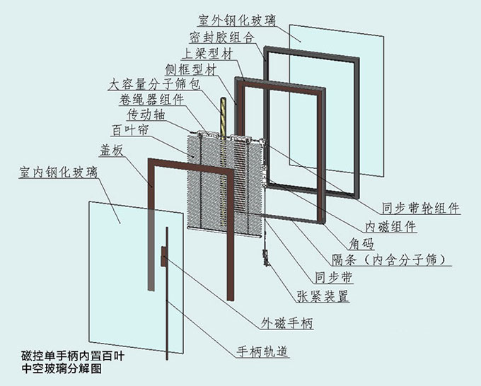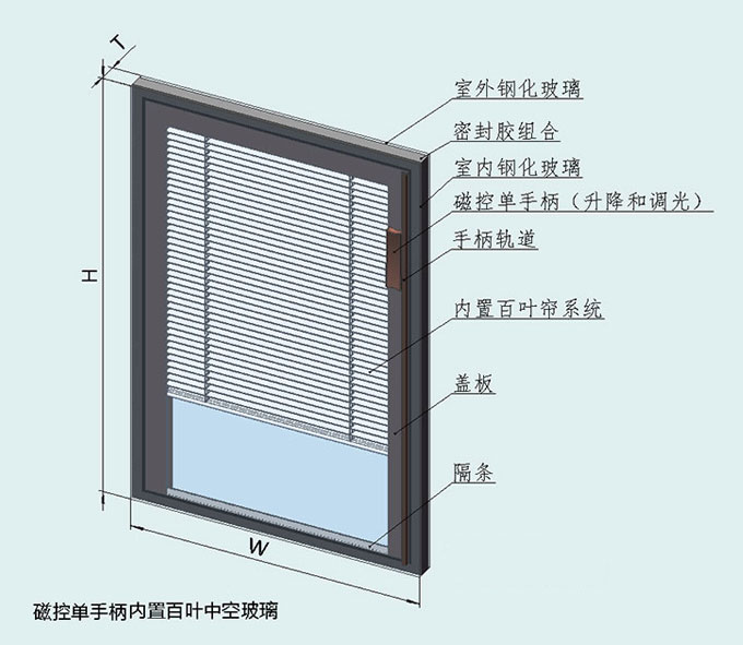單手柄磁控中空百葉玻璃窗,是指在中空百葉玻璃的室內(nèi)面,設(shè)置“一個”可沿直線方向滑動的“磁控外手柄”,通過磁力偶合技術(shù),與中空百葉玻璃內(nèi)的“磁控內(nèi)手柄”,實現(xiàn)聯(lián)動工作,來控制中空玻璃內(nèi)的百葉簾實現(xiàn)升降及百葉片翻轉(zhuǎn)。